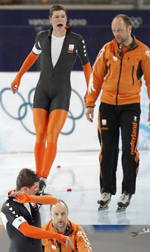 The following weekend, though, Kramer realized who was even stoopeeder: his coach, Gerard Kemkers, who ordered his athlete to switch into the wrong lane during the the 10,000 meter race, costing Kramer the gold medal and a world record. For a moment, the pity of the world was Kramer's, until he once again overreacted, flinging his goggles (understandable), kicking a lane divider (well, OK), and shoving a random Olympic volunteer (inappropriate)!