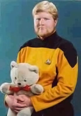 I understand that to your untrained eye, I appear to be a Starfleet officer posing for a portrait with a child's Teddy Bear, but in actuality this is a rare Cottonooti alien from the planet Fluffinalia.