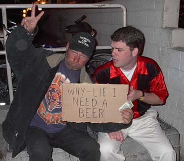 I did notice there were other individuals on the streets also looking for investors. I stopped and chatted with a fellow who looked to be interested in opening a bar (his sign read "Why lie I need beer"), and thought he might be interested in going in with me on the Cap'n Wacky hotel and casino. He didn't seem particularly interested. Or sober. Also, he didn't smell so good.